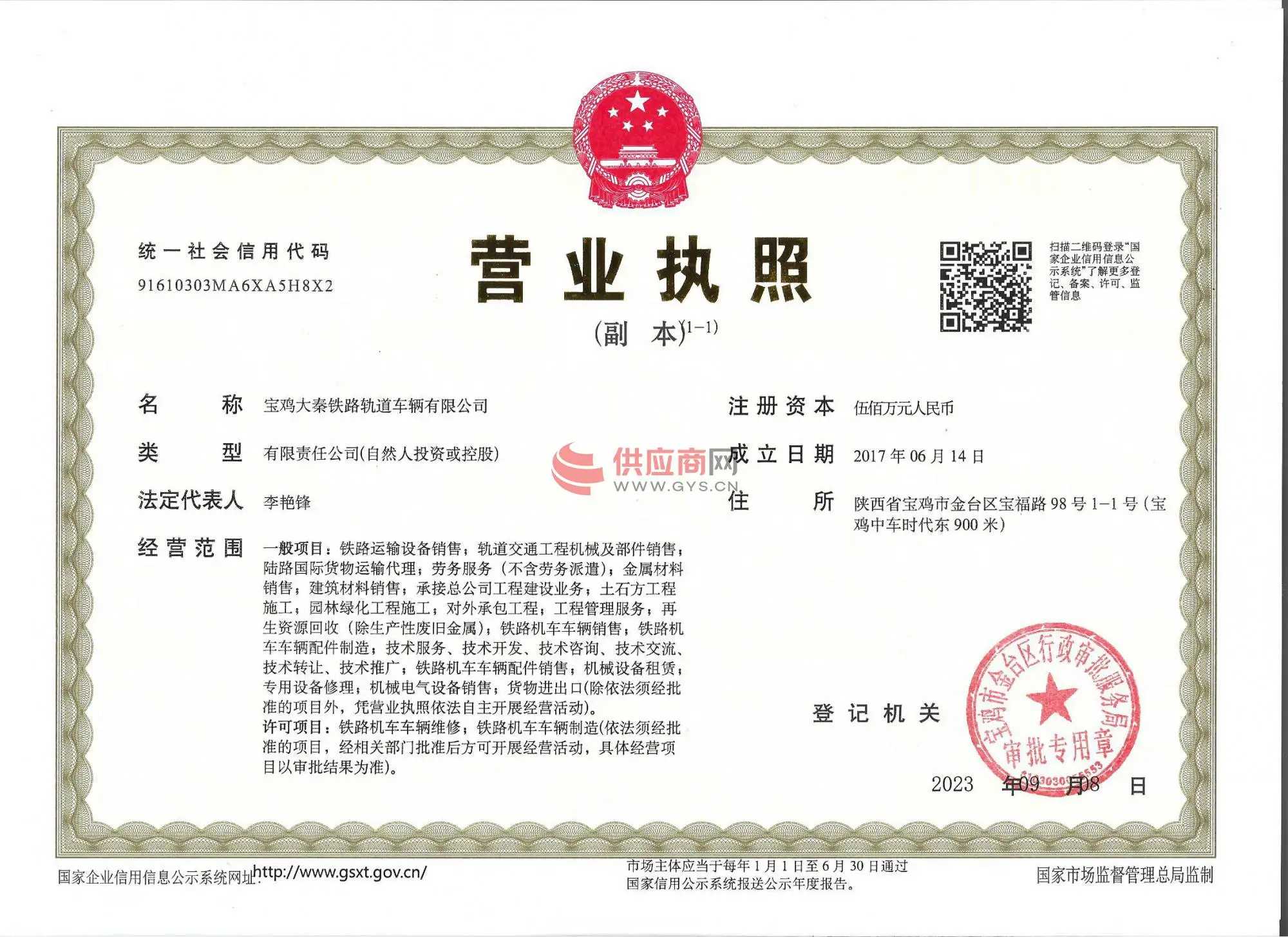 主营产品:宝鸡大秦铁路轨道车辆有限公司主要以铁路内燃机车、轨道车租赁、销售为主;同时具备铁路物资、内燃机车配件、轨道车配件、铁路器材的加工生产销售。本企业销售产品通过铁科院CRCC认证。